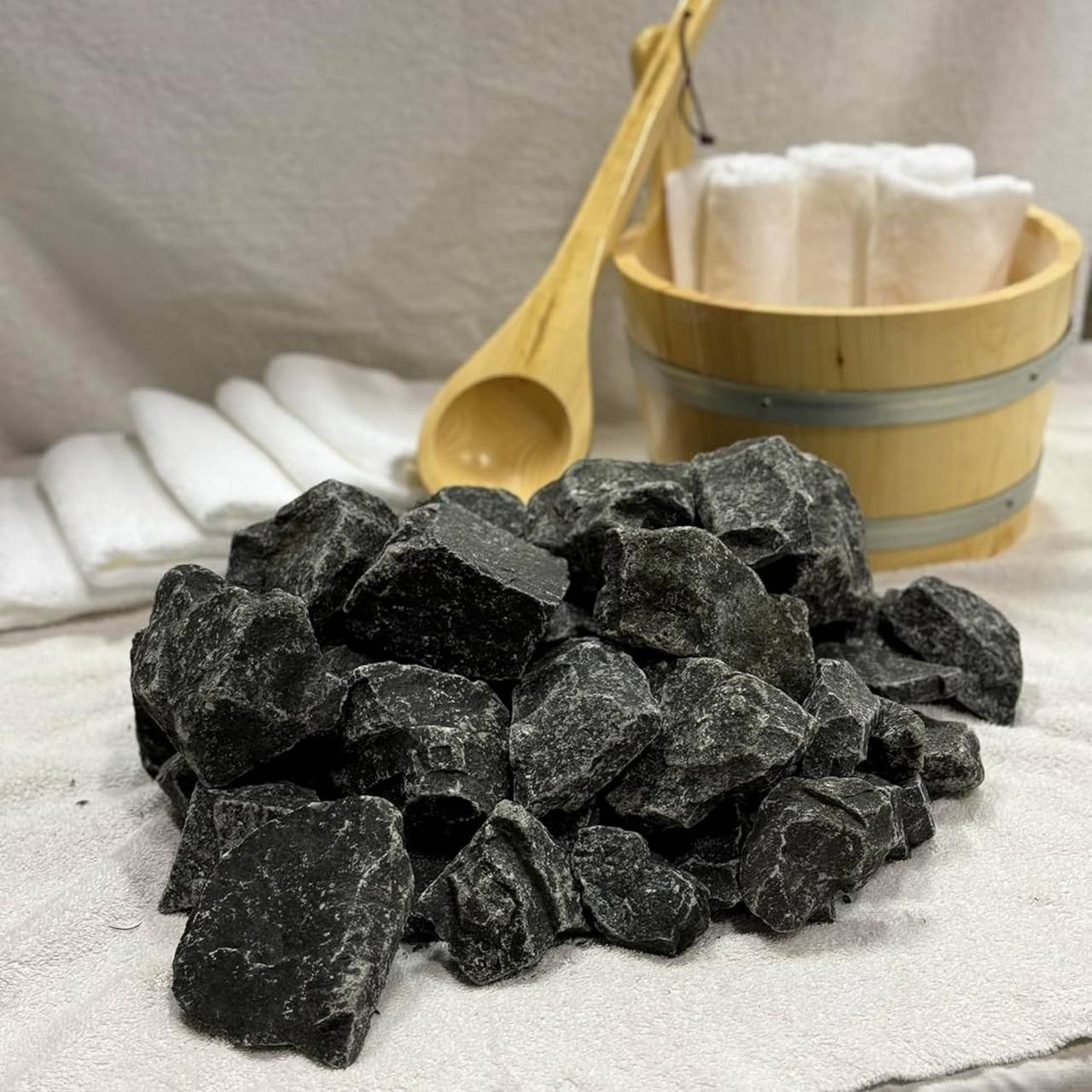 Представляет собой глубинную горную породу темно-серого цвета, сочетающую одновременно свойства габбро и диабаза. Устойчив к высоким температурам, но нагревается дольше аналогов. При попадании воды образует много «тяжелого» пара, что понравится не всем. Лучше всего подходит для дровяной печи с открытыми камнями.