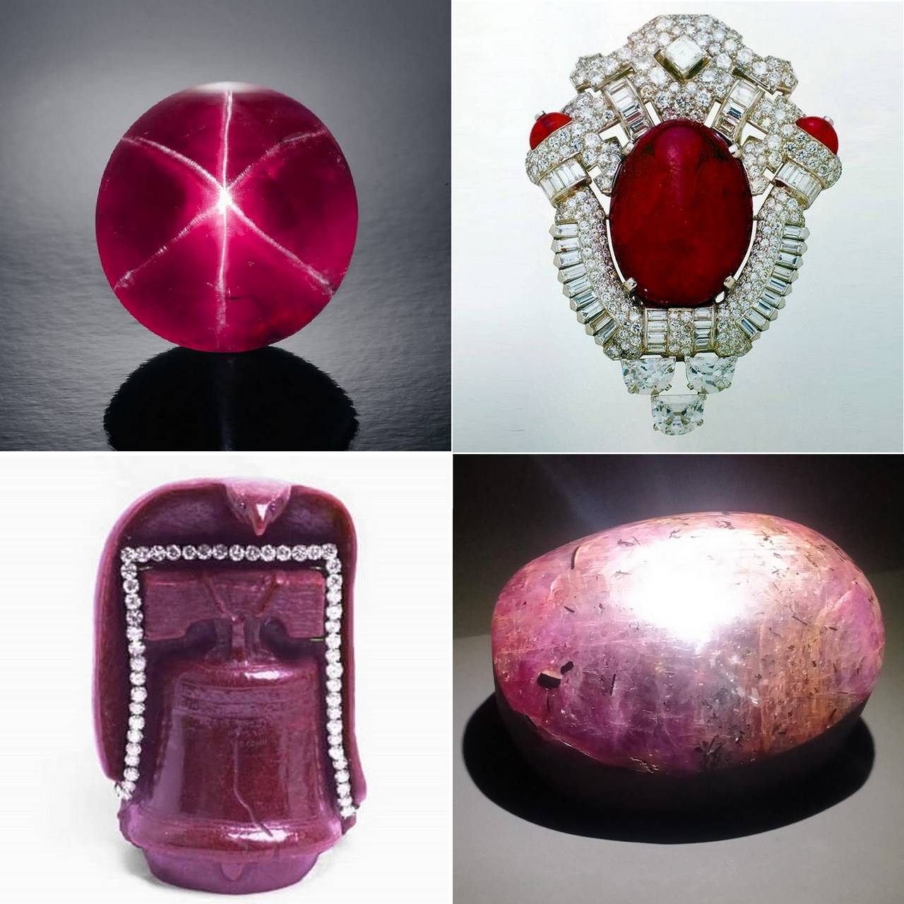 Самые крупные рубины мира: “Восход Солнца”, “Звезда Фуры”, “Звезда Бирмы”, Рубин Делонга, “Россер Ривз”, “Принц Бирмы”, “Ниланджали”, “Рубин Адского Запрета”, “Колокол Свободы”, “Звездный рубин Махарлика”.