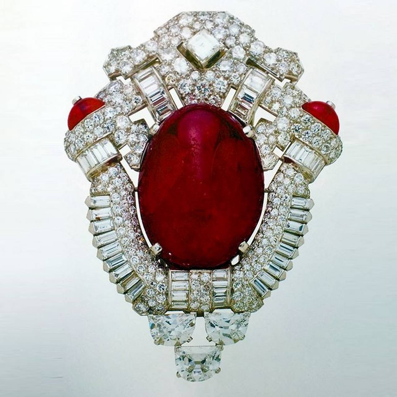 83-каратный рубин цвета «голубиной крови» огранен в форме кабошона. Оправа в виде броши или подвески изготовлена из платины и инкрустирована бриллиантами.
