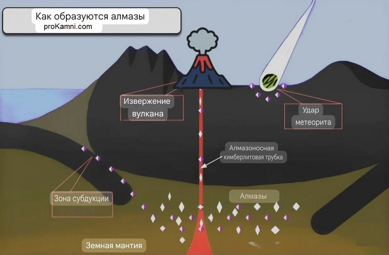 Формирование алмазов проистекает на 150-200-километровых глубинах в мантии, где царит колоссальное давление – от 45000 до 60000 атмосфер. Это в 50-70 раз выше давления в Марианской впадине. Температура в этих глубинах достигает 1100-1300°C, что сопоставимо с температурой поверхности Солнца!