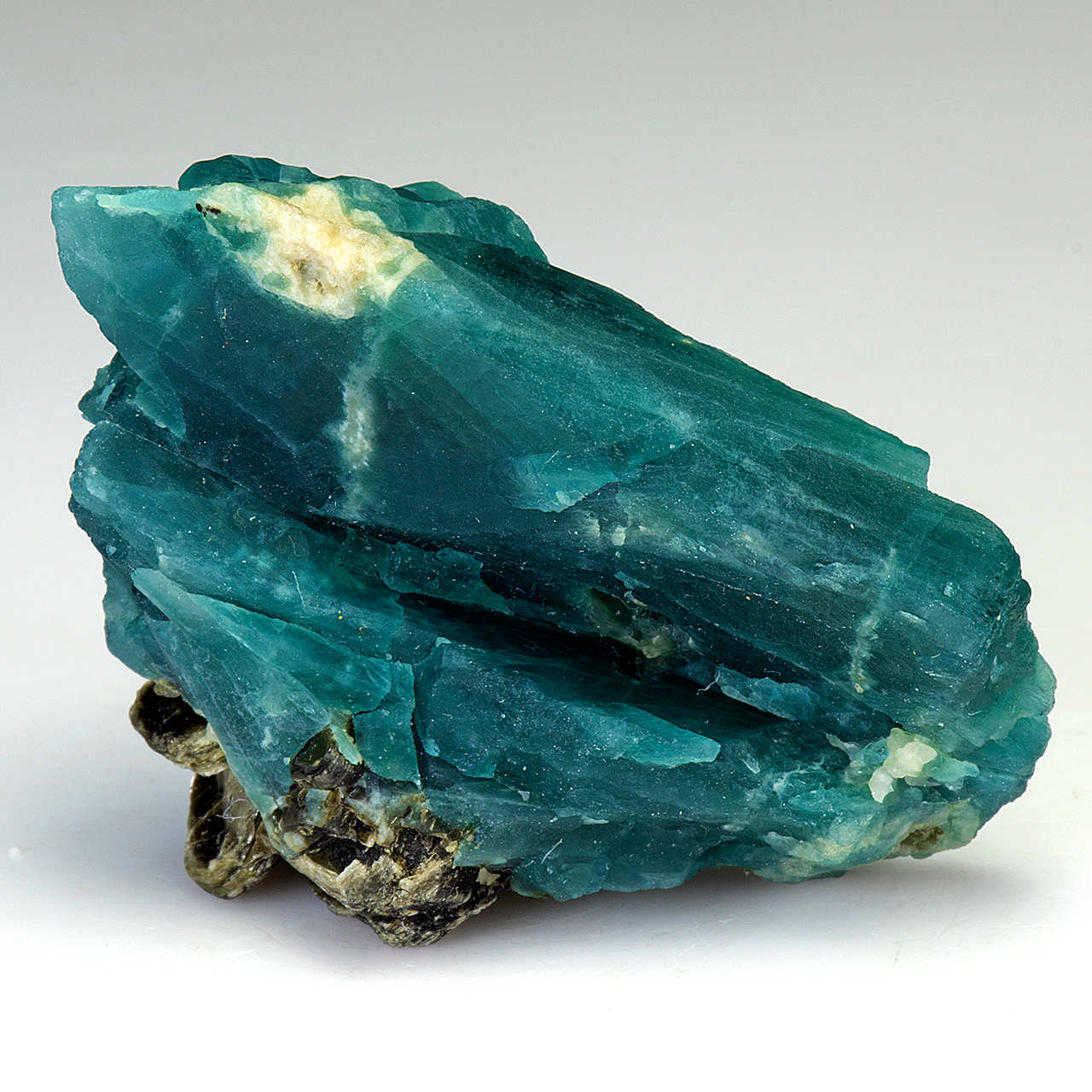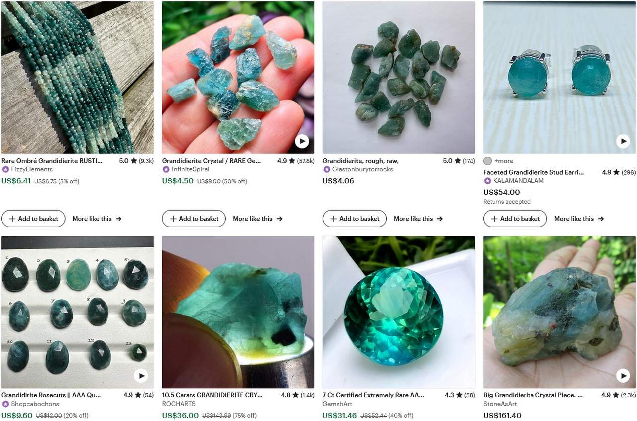Грандидьерит обычно встречается в виде просвечивающихся или полупрозрачных кристаллов голубовато-зеленых оттенков, от нежного небесного до насыщенного аквамаринового. Чем больше железа содержится в составе, тем более синим он выглядит.