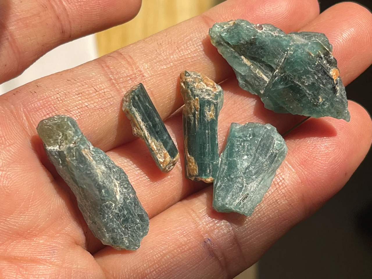 Минерал обладает плеохроичными свойствами. В зависимости от угла обзора его цвет меняется от темно-зеленого и зеленовато-синего до бледно-желтого и бесцветного.
