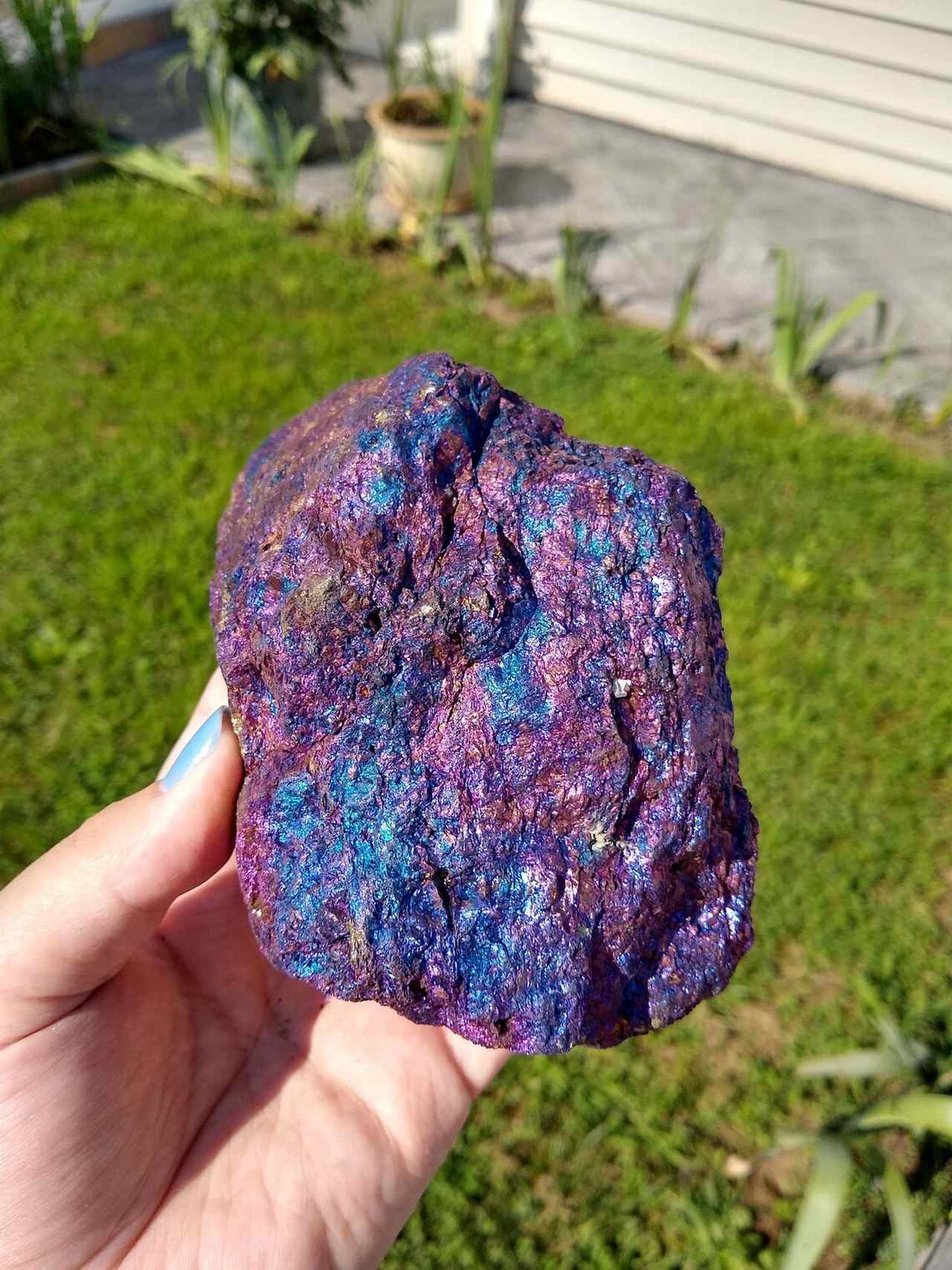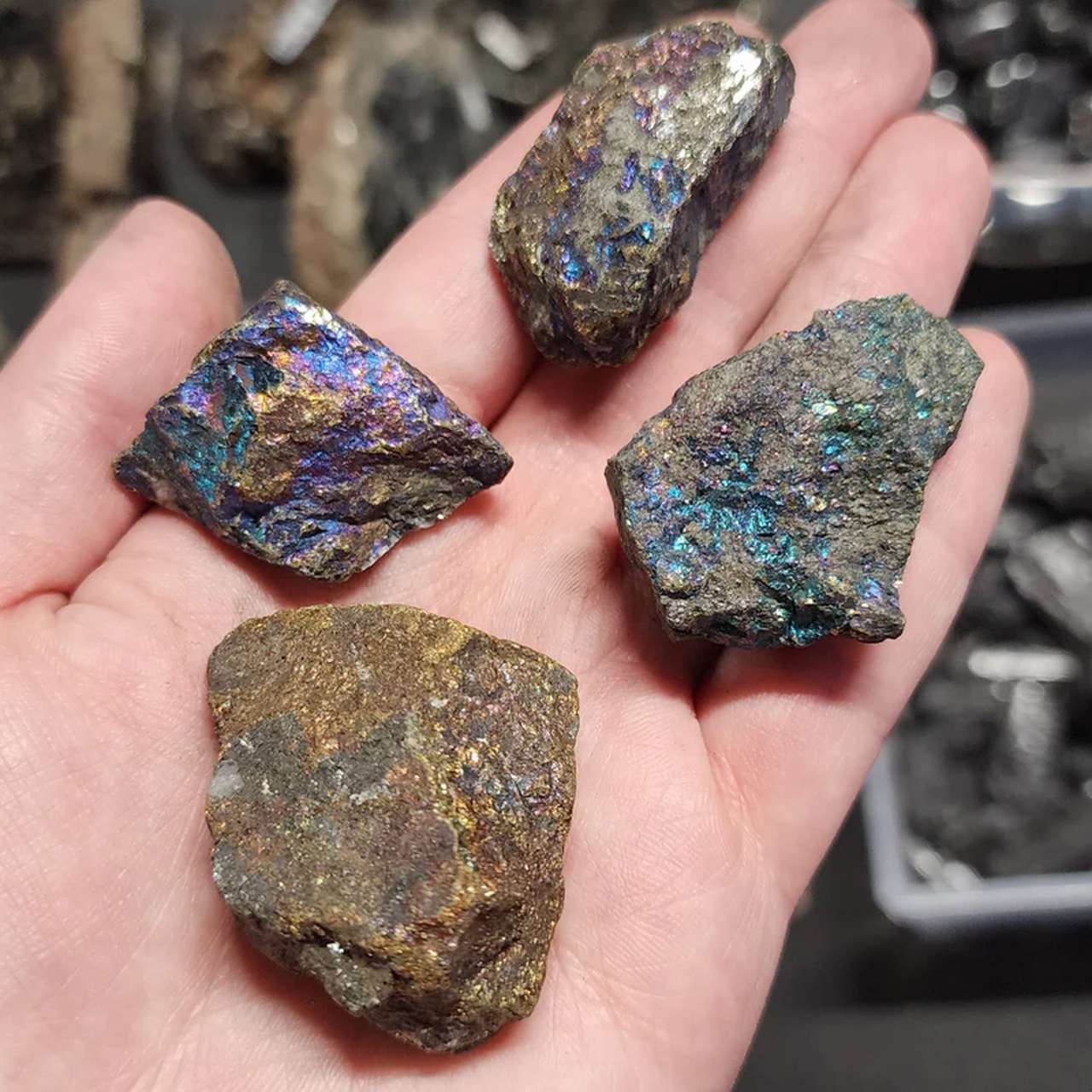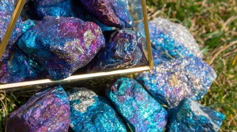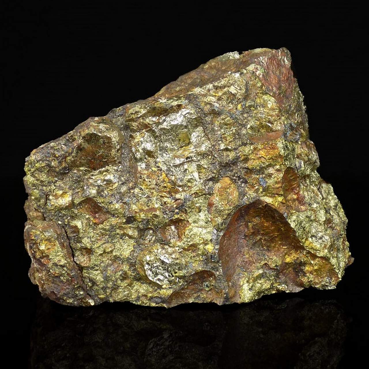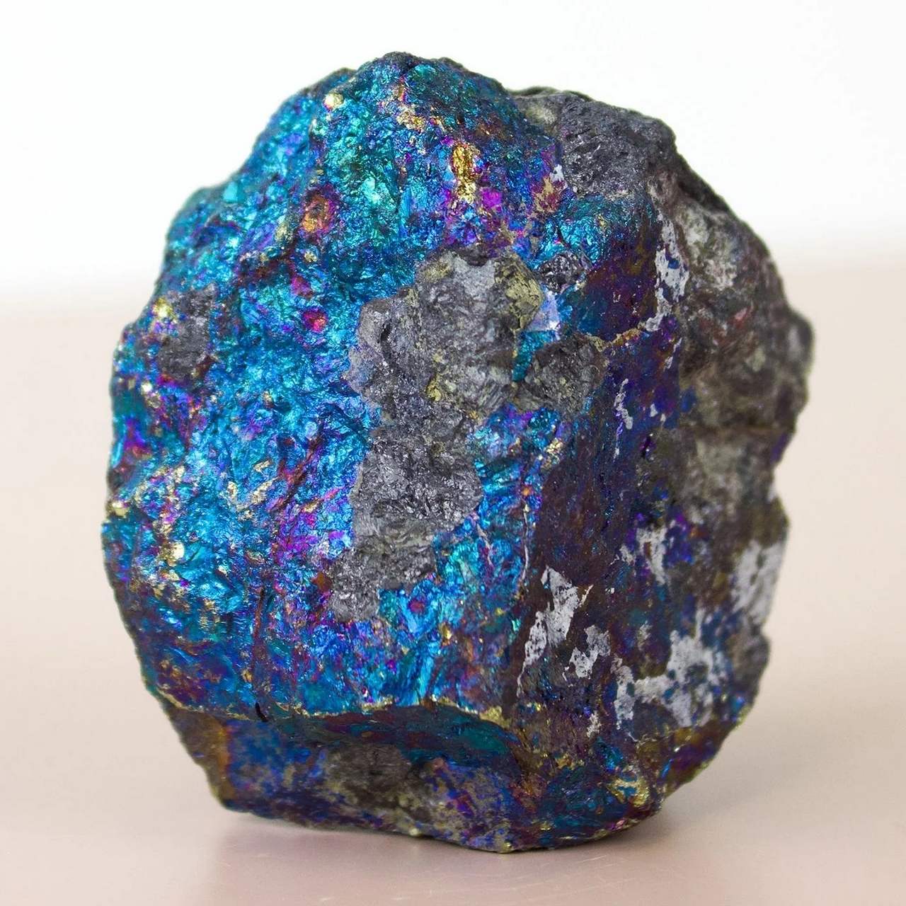 Халькопирит, более известный как медный колчедан, представляет собой минерал из группы сульфидов меди и железа. Это популярный коллекционный и поделочный камень. Интересен тем, что изначально его кристаллы напоминают пирит желто-золотистого цвета. Но со временем на воздухе окисляются, приобретая яркую «бензиновую» радужную окраску.