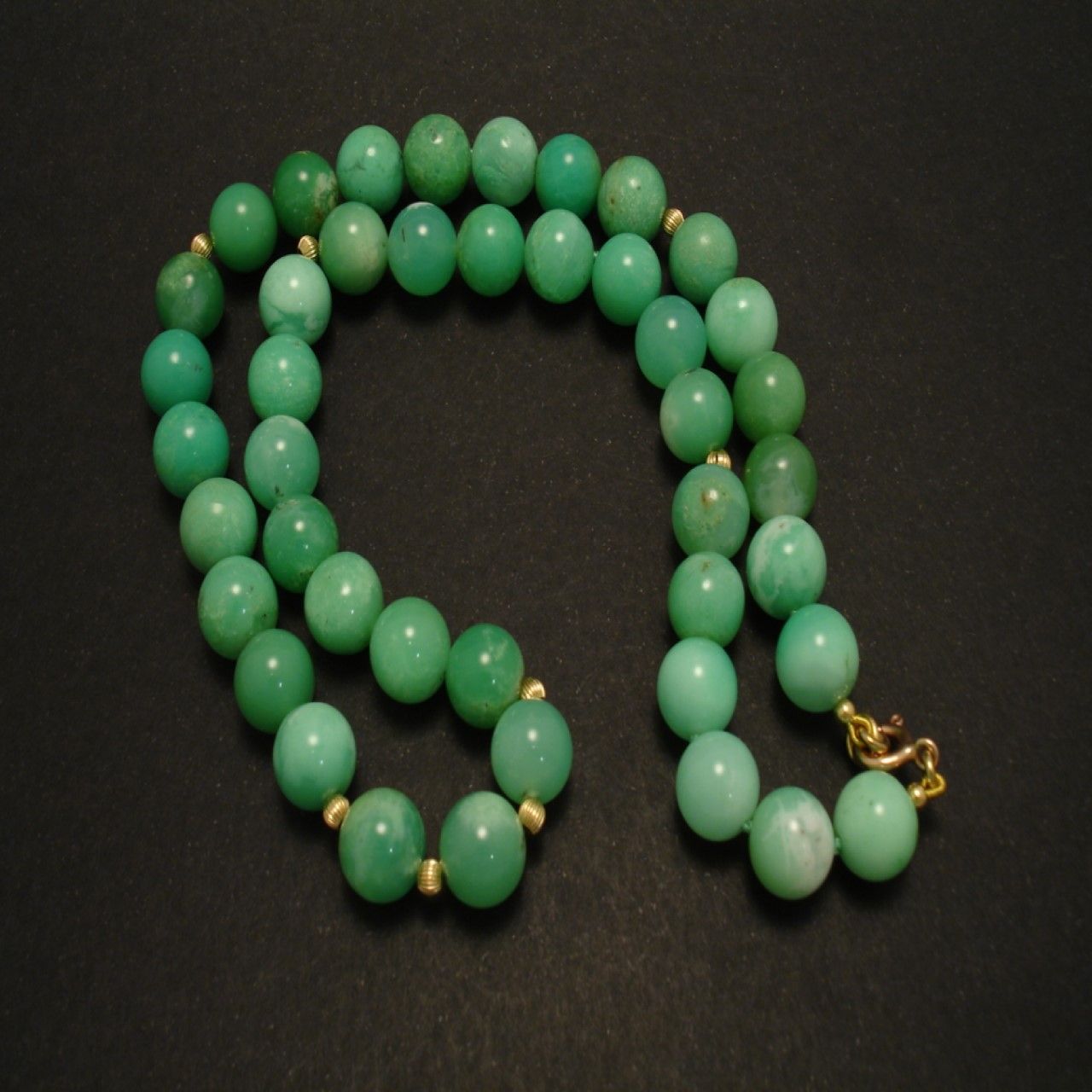 Ювелирный хризопраз идет на изготовление кабошонов и плоских вставок для инкрустации украшений и художественных изделий. Наибольшую глубину цвета передают овальные высокие кабошоны высшего качества.