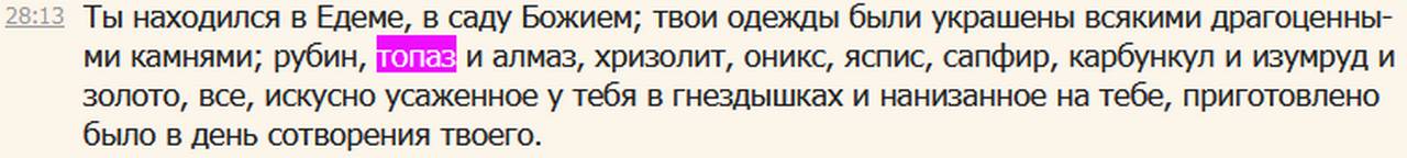 В Библии самоцвет упоминается несколько раз. В книге Бытие говорится, что топаз был одним из камней, украшавших нагрудник первосвященника. В книге Песнь песней говорится, что минерал служит символом красоты и совершенства.