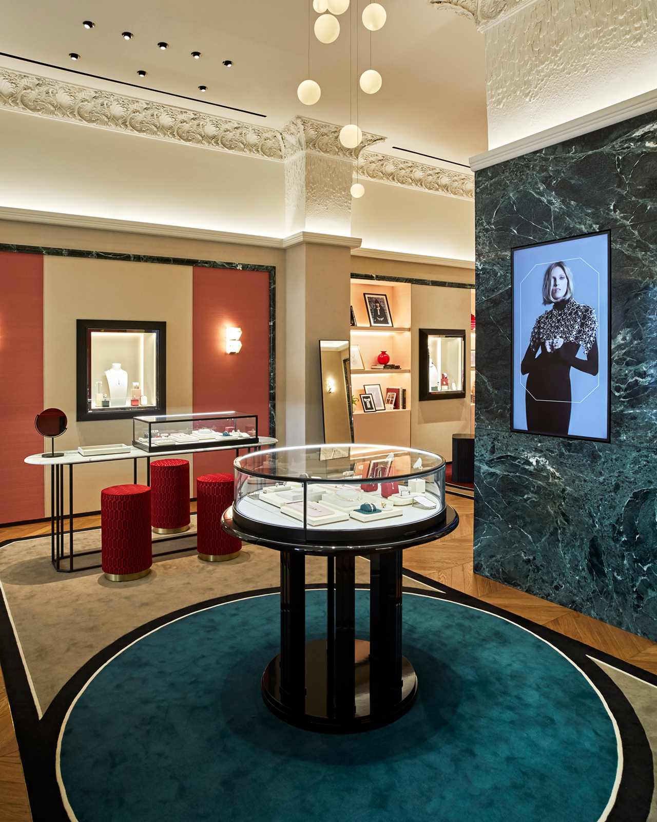 Интерьер бутика соединяет дух Парижа и Нью-Йорка. Французские люстры Maison Delisle и лаковый сундук из исторического флагманского магазина на Пляс Вандом сочетаются с американским ар-деко. Геометрия фасада и теплые тона интерьера отсылают к модернистскому стилю Нью-Йорка начала XX века.