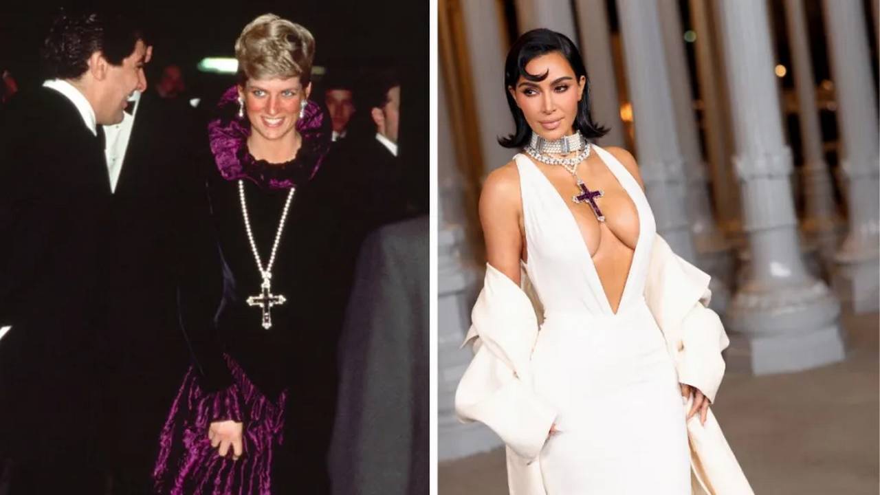 На вечер Кардашьян выбрала белое платье от Gucci с глубоким декольте, дополнив крест жемчужными чокерами и накидкой. Этот выход напомнил о культовом образе Дианы 1987 года, когда она носила крест с бархатным фиолетовым платьем от Кэтрин Уокер.